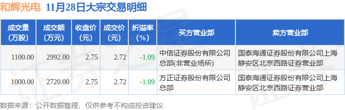 证券之星消息,11月28日和辉光电发生大宗交易,交易数据如下: