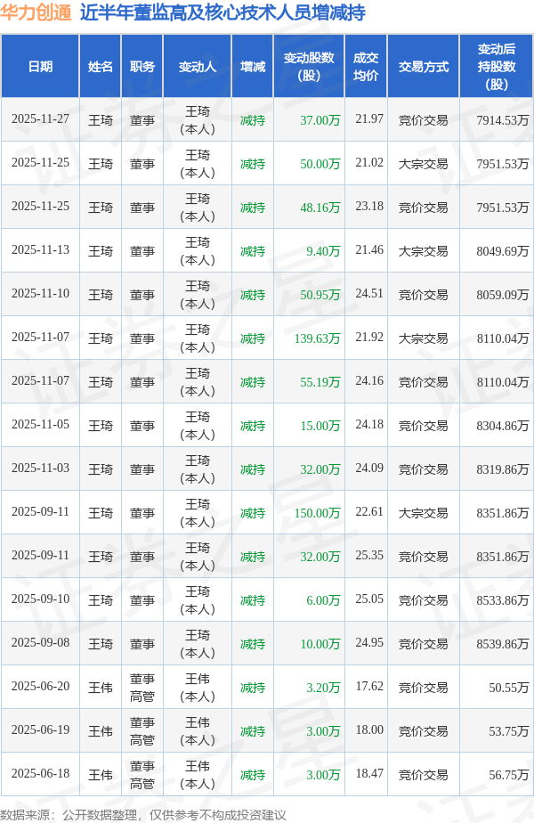 华力创通近半年内的董监高及核心技术人员增减持详情如下: