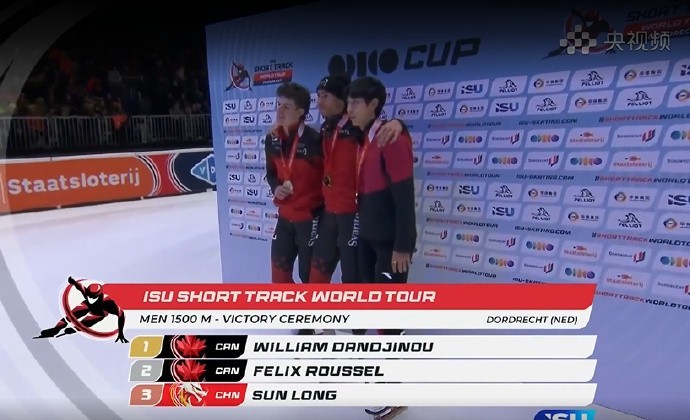11月29日,国际滑联短道速滑世巡赛多德雷赫特站,中国选手孙龙在男子1500米项目上摘铜,加拿大选手丹吉努夺金,罗塞尔获得第二。