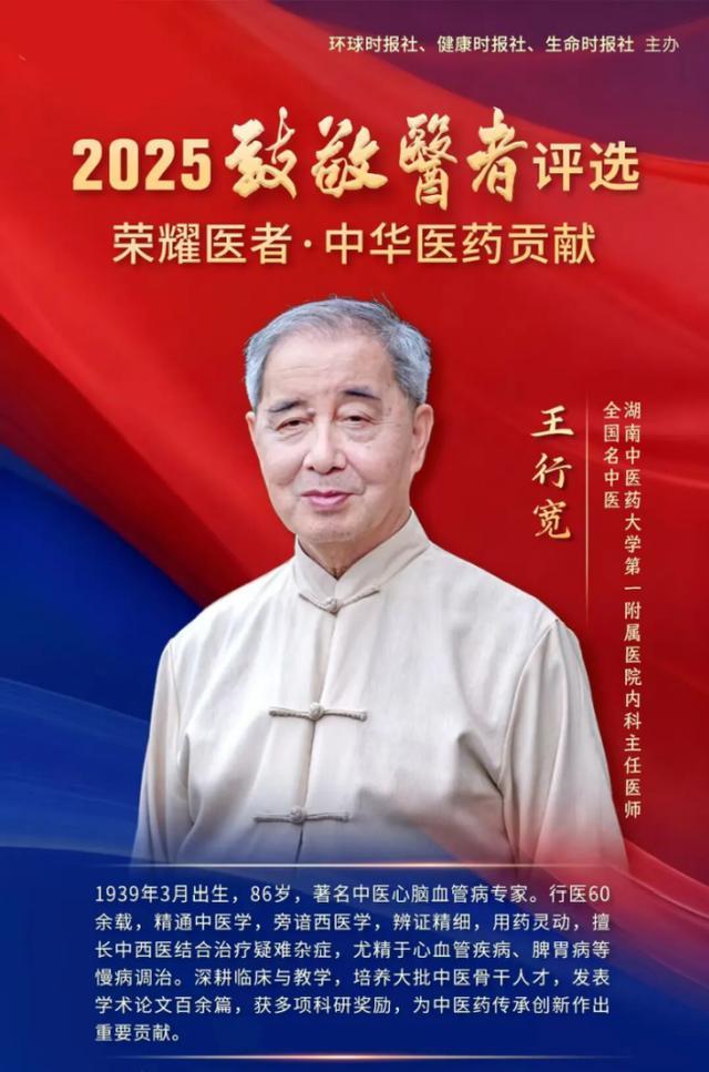 全国名中医、湖南中医药大学第一附属医院内科主任医师王行宽教授荣获“荣耀医者·中华医药贡献”荣誉。