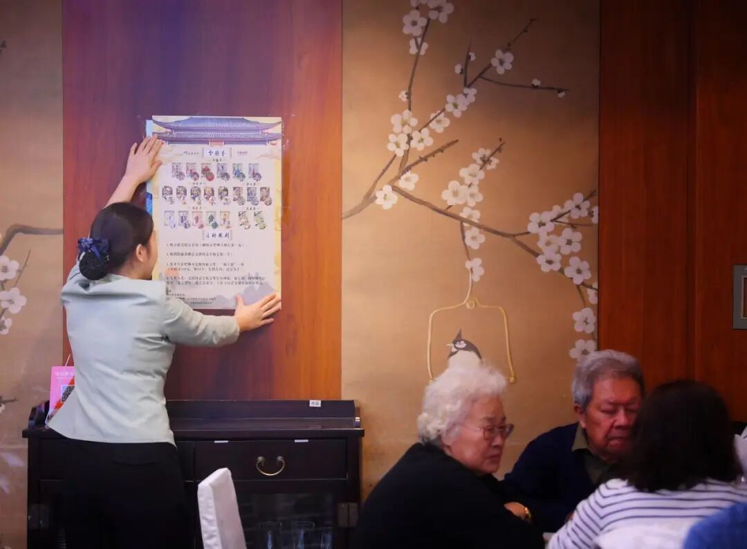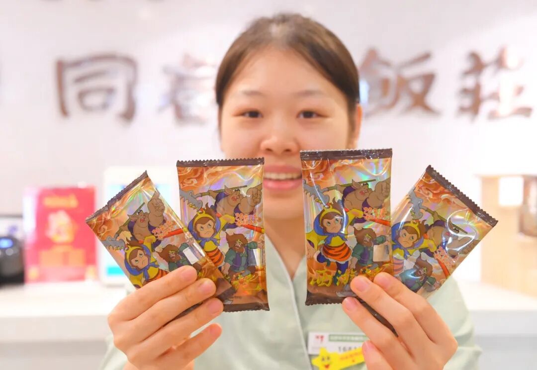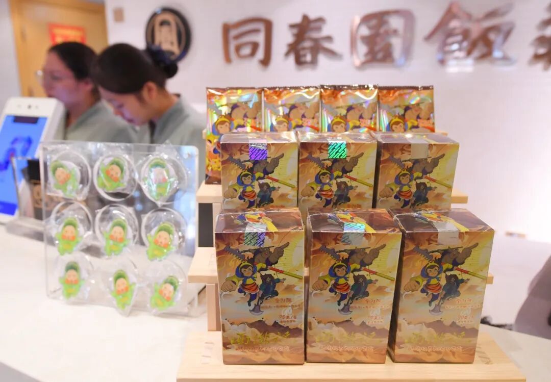 走进“鲁菜泰斗”同和居月坛店,浓郁的西游氛围扑面而来。门口悬挂着“华天×西游记”盲盒“吧唧”,外卖窗口、收银台随处可见西游周边物料。“我抽中了最想要的‘孙悟空’卡牌,这顿饭也太惊喜了!”在同和居月坛店用餐的顾客李女士举着刚拆开的盲袋,兴奋地与餐桌旁的西游主题装饰合影。
