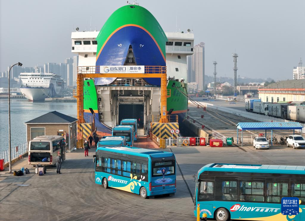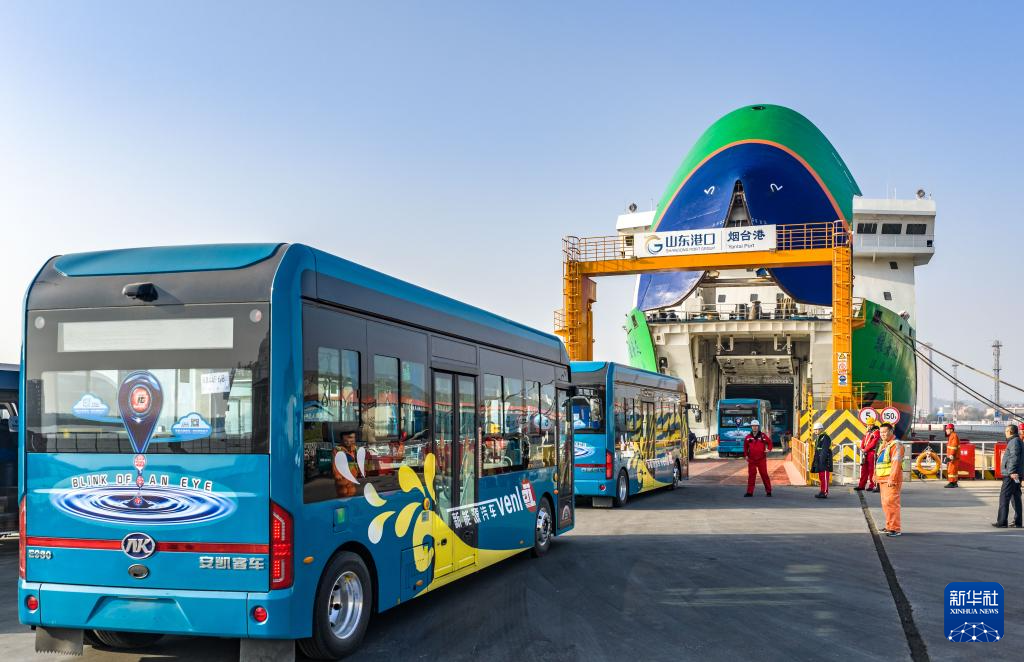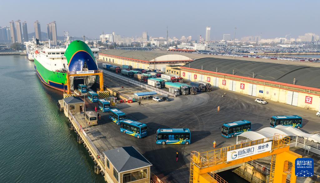 11月30日,一批全新的纯电动公交车在山东港口烟台港登上新能源汽车运输船“绿安达”轮,跨越渤海海峡前往辽宁大连,交付大连交运集团(无人机照片)。
