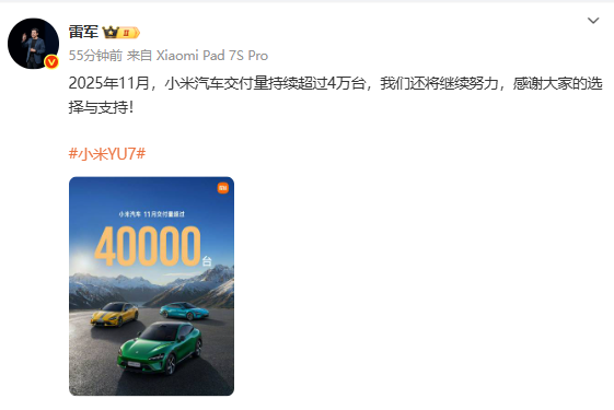 【CNMO科技消息】12月1日,小米汽车官方宣布,2025年11月交付量再次突破4万辆,连续三个月交付量保持在4万台以上。据官方介绍,该数据统计时间为2025年11月1日0点至11月30日24点。雷军对此表示:我们还将继续努力,感谢大家的选择与支持!