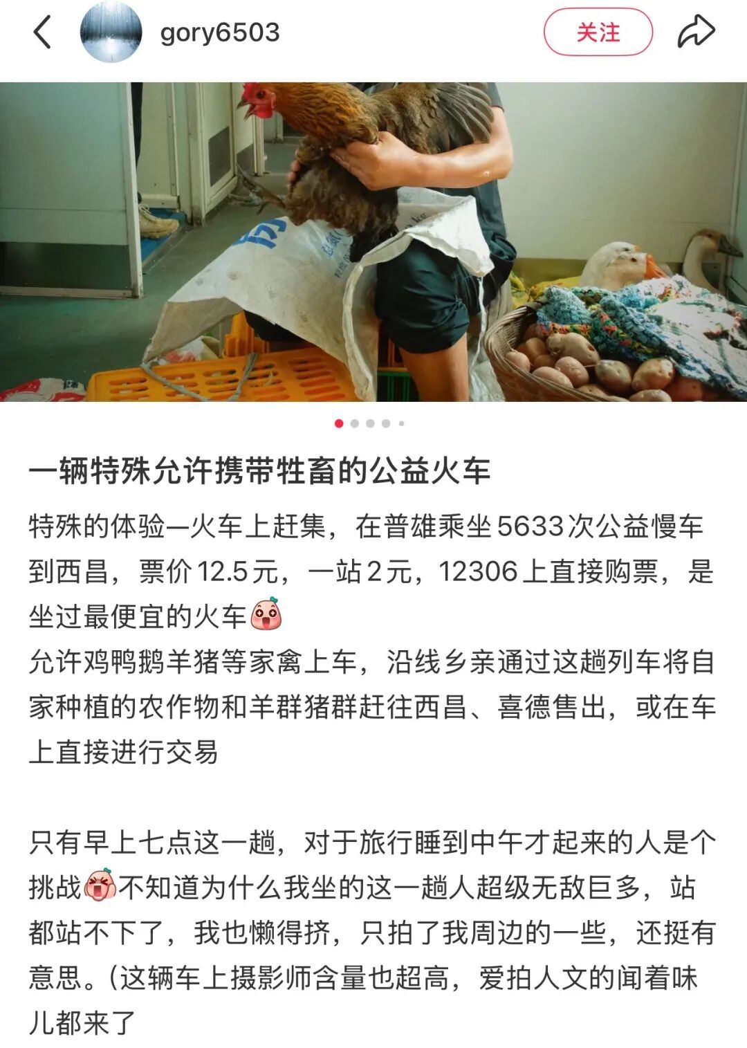 一位2022年乘坐过、从始发站普雄坐到西昌下车的摄影博主表示,根据穿着和语言,临近的三个车厢只有他一个外地人。她一打开厕所门发现还拴着一只羊,是因为不听话被主人“关禁闭”的。