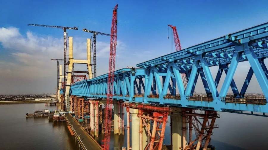 作为大桥四座主塔中唯一一座的江中主塔,南主塔设计高度达350米,相当于125层楼高,总用钢量约3.4万吨,相当于4.6座埃菲尔铁塔的用钢量。主塔采用世界首创的“钢箱-钢管混凝土约束组合体系”,在实现塔身“瘦身强体”的同时,大幅降低结构自重约50%,显著提升抗风抗震性能达30%。塔柱由30个预制节段像“搭积木”一样逐段拼装而成,由位于如皋长江边的中铁山桥南通公司生产建造,充分体现了桥梁装配化、工业化施工的先进水平。
