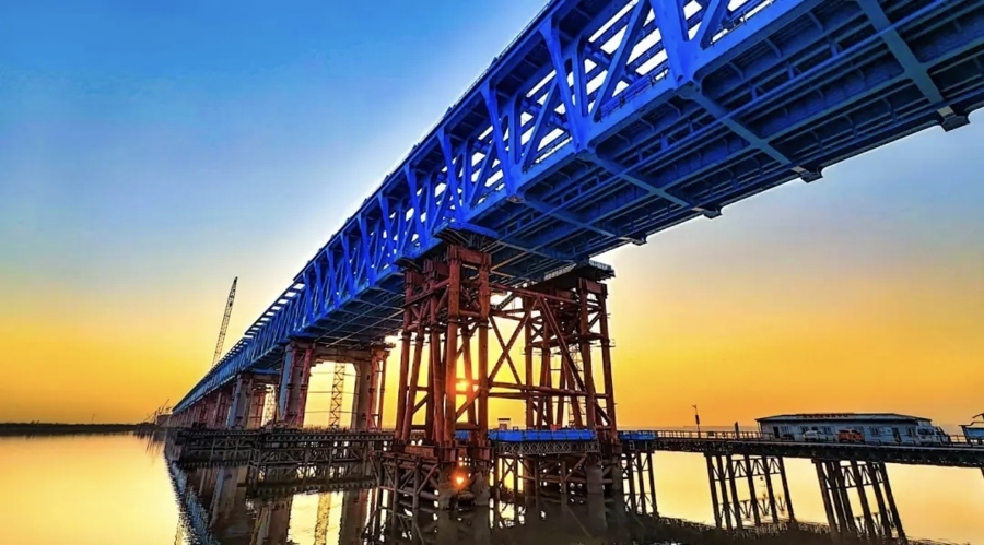 无独有偶。今天,由中铁大桥局承建的沪渝蓉高铁崇启公铁长江大桥主通航孔桥南边跨钢梁顺利顶推到位,非通航孔钢梁将冲刺最后7米,近日在主桥1号墩墩顶主通、非通钢梁将“胜利会师”,标志着这座长江上时速最快的公铁两用大桥后续即将转入斜拉索安装和中跨钢梁吊装施工阶段。