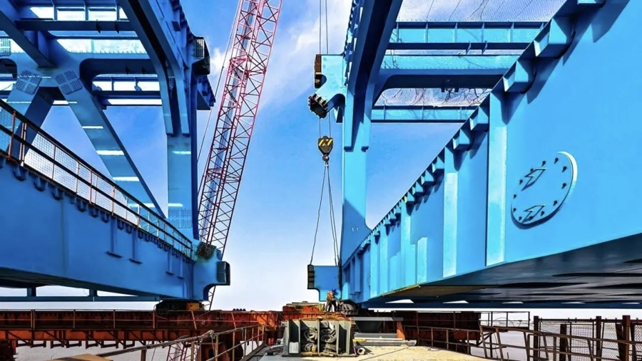 崇启公铁长江大桥主通航孔钢桁梁总长992米,主跨400米,共6个桥墩,其中,上海侧南边跨长322米,公路面宽33米,铁路面宽25.7米。钢梁南边跨15节,北边跨14节,均采用整节段吊装与顶推施工工艺。据现场负责人戴翔介绍,此次主通航孔桥南边跨钢梁是最后一次顶推,长度6.5米,主要把钢梁的横向抗风支座精准顶推到位。崇启公铁长江大桥钢梁顶推采用智能化顶推系统,实时监控,自动纠偏、误差自动修正(精度可达±1mm),保证钢梁在顶推过程中的空间姿态及桥梁线型的同时做到“毫米级精度”就位。