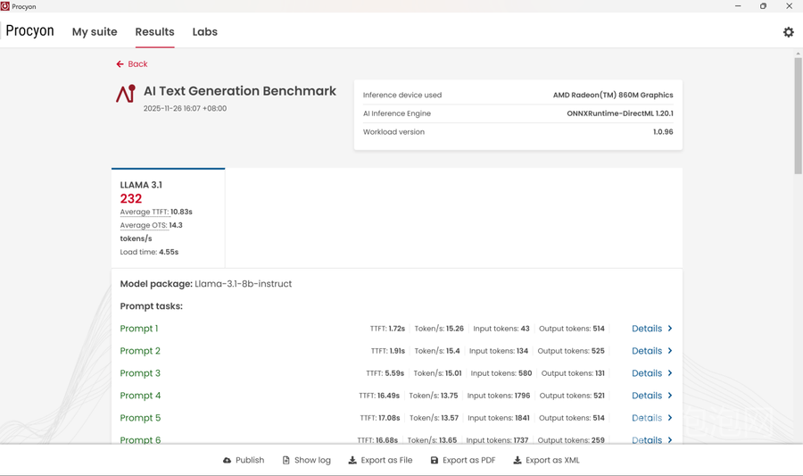 在UL Procyon AI Text Generation Benchmark中,针对各类本地大模型的加载以及输出token的速度,喵Book14 Pro的表现也十分出色,我们测试的LLama-3.1-8B项目获得232分平均延迟和每秒Token数量也都有着出色的表现,证明其性能可以充分满足上述AI大模型的使用需求。