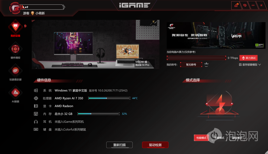 除此之外,喵Book14 Pro也预装了其游戏本以及板卡产品所配备的“自在星球”,也就是原来大家熟悉的iGame Center。支持在其中更新硬件驱动、调节参数以及性能模式等等功能。如果你用过七彩虹的游戏本或者主板、显卡,熟悉的界面和功能能让你轻松上手。