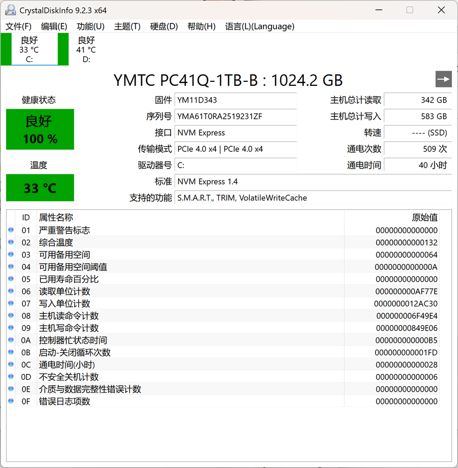 储存方面,通过CrystalDiskInfo可以看到,喵Book14 Pro采用了来自长江存储的PC41Q 1TB PCIe 4.0 SSD,采用了自家的QLC闪存颗粒,是目前不少国内厂商采用的OEM专供硬盘产品。我们也通过CrystalDiskMark测试了这块硬盘的读写速度。
