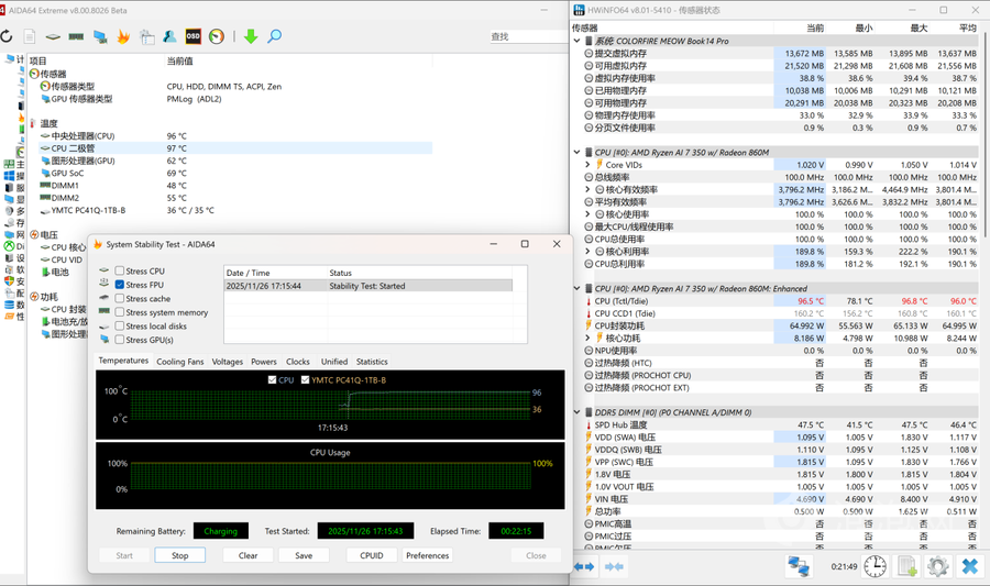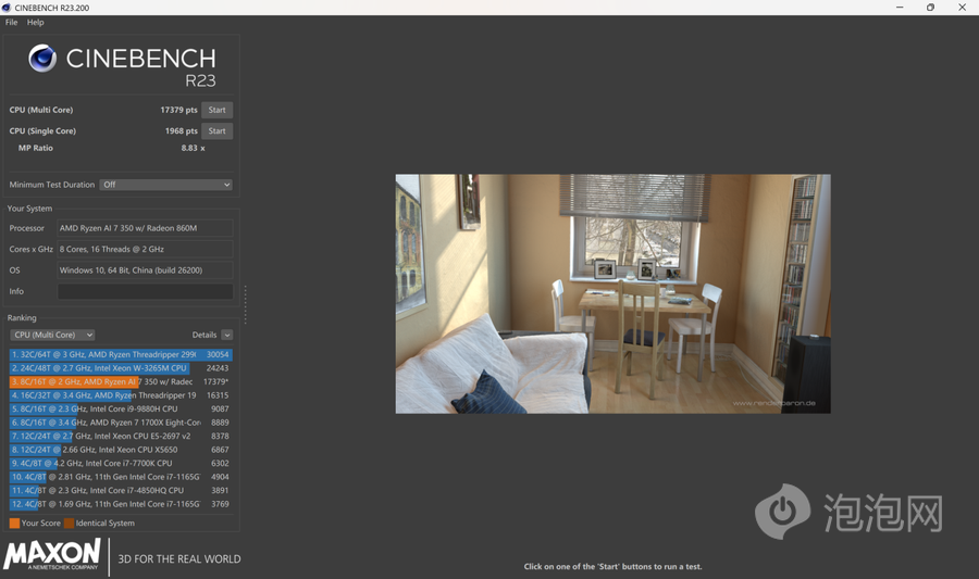 在Cinebench R23当中,锐龙AI 7 350处理器多核成绩17379pts,单核成绩 1968pts,跑分成绩非常不错,与当下的主流轻薄本产品表现相差无几。