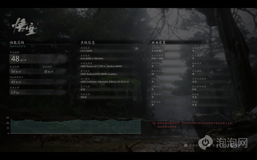 既然网游表现尚可,我们也测试了对性能要求极高的《黑神话:悟空》。同样在1920x1200分辨率、中画质下,开启FSR和帧生成后,平均帧可以达到48帧,对于一款核显本来说这样的表现显然是非常不错了,如果想要更流畅的体验也可以进一步降低画质。