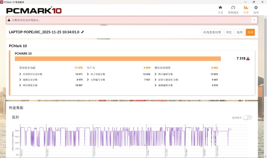 在PCMark10整机性能测试中,喵Book14 Pro常用基本功能得分11076,生产力得分为9999,数位内容创作得分为9602,综合得分为7318,拥有出色的表现,不但能够保证日常办公等场景下的流畅使用,还可以胜任轻度生产力或是创作。
