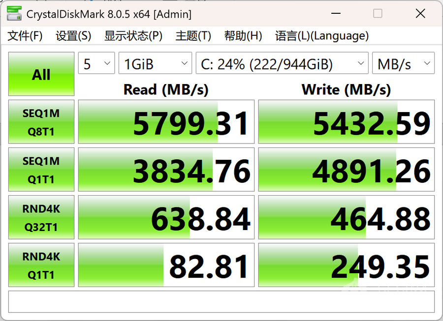 从测试结果来看,该硬盘连续读写速度分别为5799.31 MB/s、5432.59 MB/s,4K随机读写速度达到了82.81 MB/s和249.35 MB/s,速度达到了主流PCIe 4.0 SSD的水平,搭配1TB的大容量,足以满足日常使用和游戏的需求,双硬盘位的配备也能够满足更大容量的存储需求。