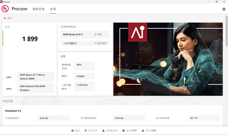 在AI算力上,锐龙AI 7 350处理器搭载了XDNA 2架构的AMD锐龙AI NPU,AI算力高达50 TOPS,能高效处理各类AI相关任务。在UL Procyon的AI推理测试中,AMD Ryzen AI项目上,锐龙AI 7 350处理器的NPU性能分数为1899分,能高效完成图像识别、语音处理等AI推理任务。