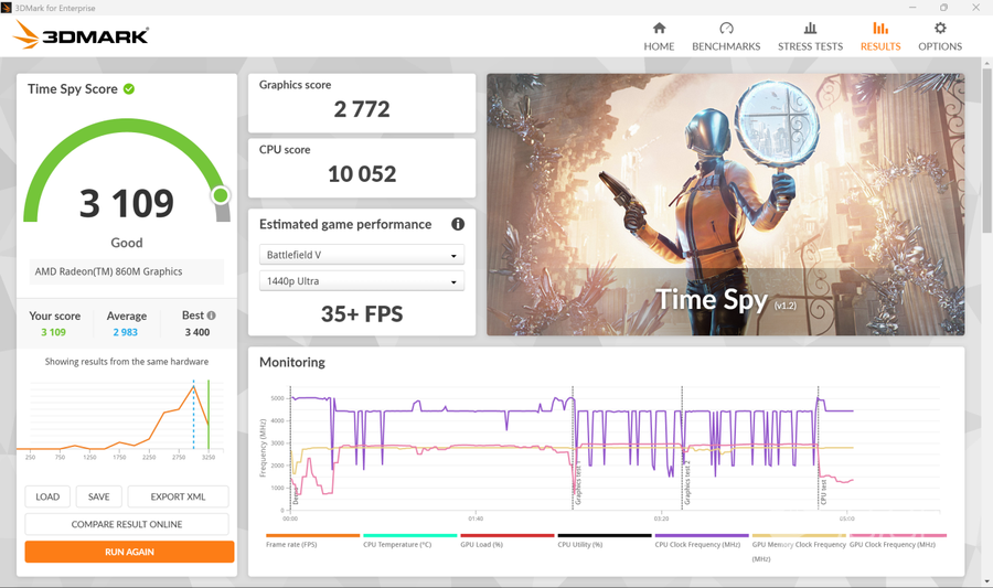 看完CPU,我们再来看看Radeon 860M核显的表现如何。在3DMark跑分测试中,Radeon 860M表现出色,Time Spy显卡分为2772分,Fire Srike显卡分为7386分,成绩甚至已经接近部分入门级独显,足以满足日常使用甚至轻度生产力需求。