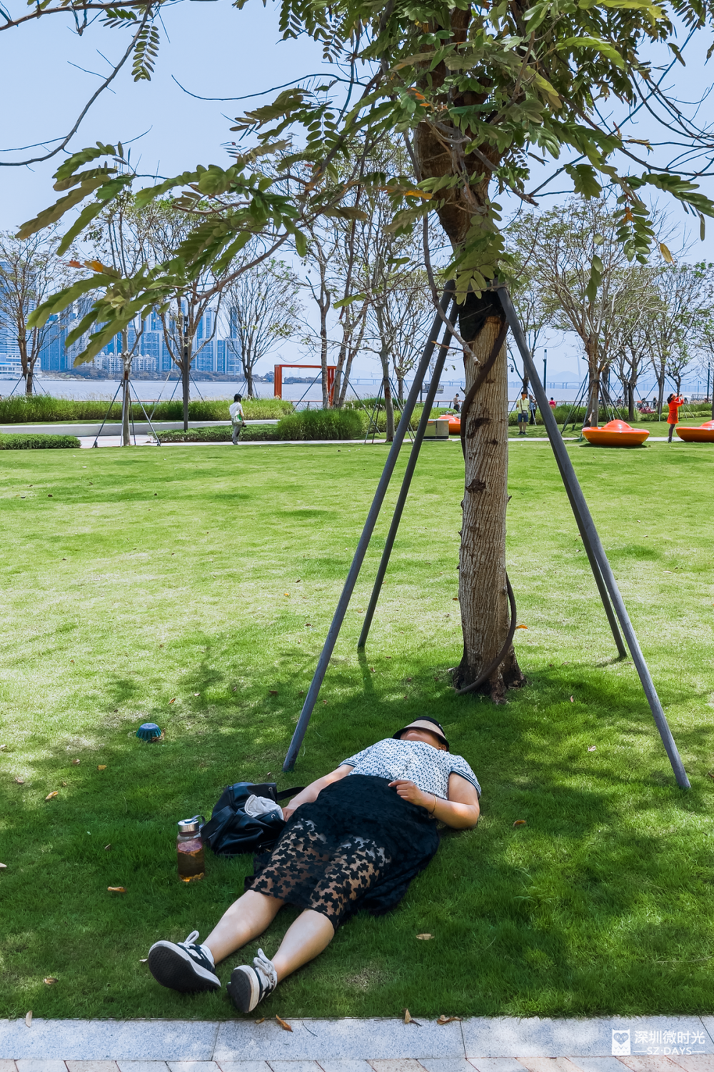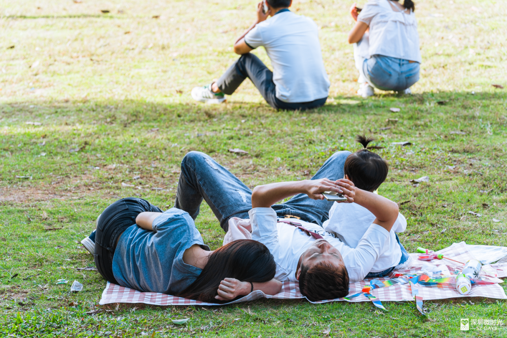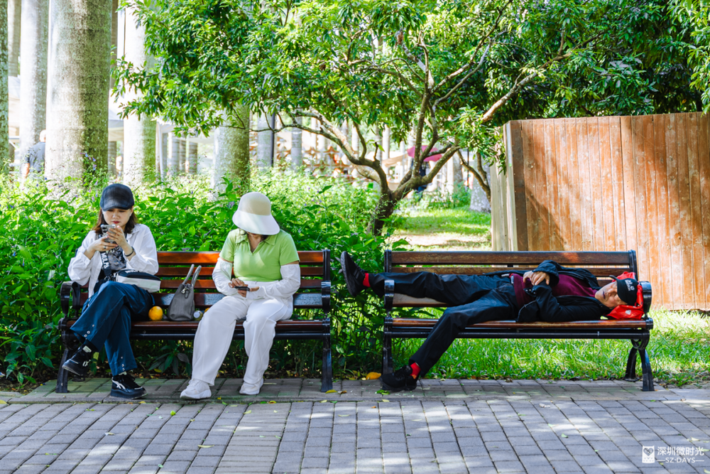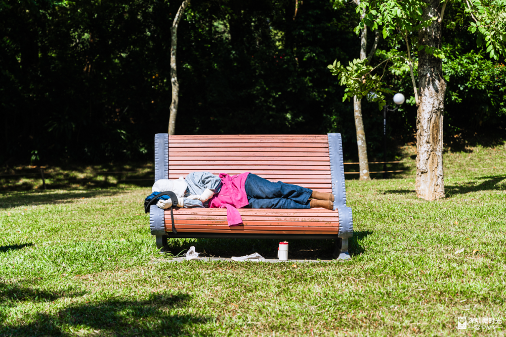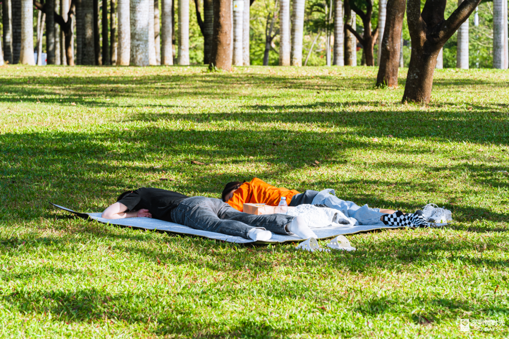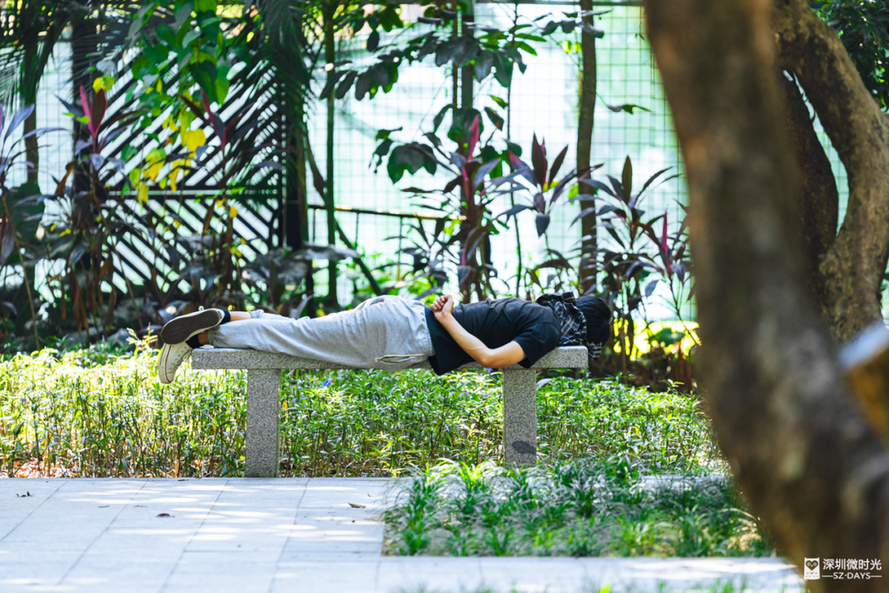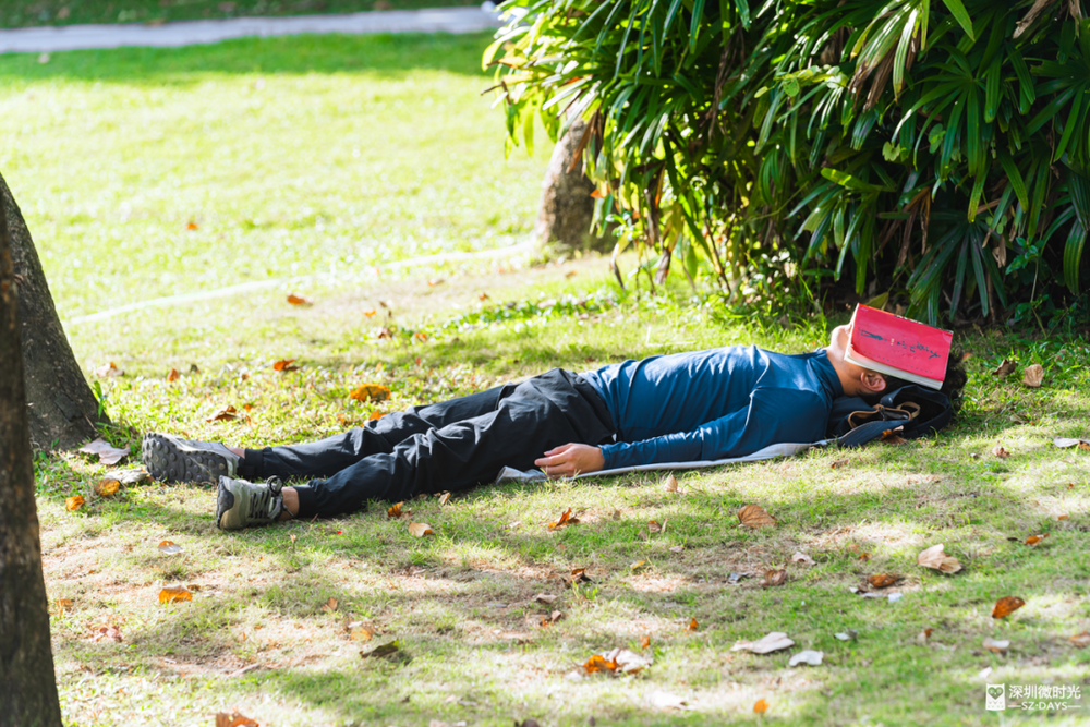 树荫挡住日光,风吹叶响是自然的白噪音。深圳公园的草地上,总能遇见最放松的睡姿。