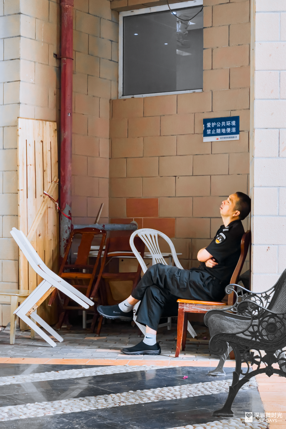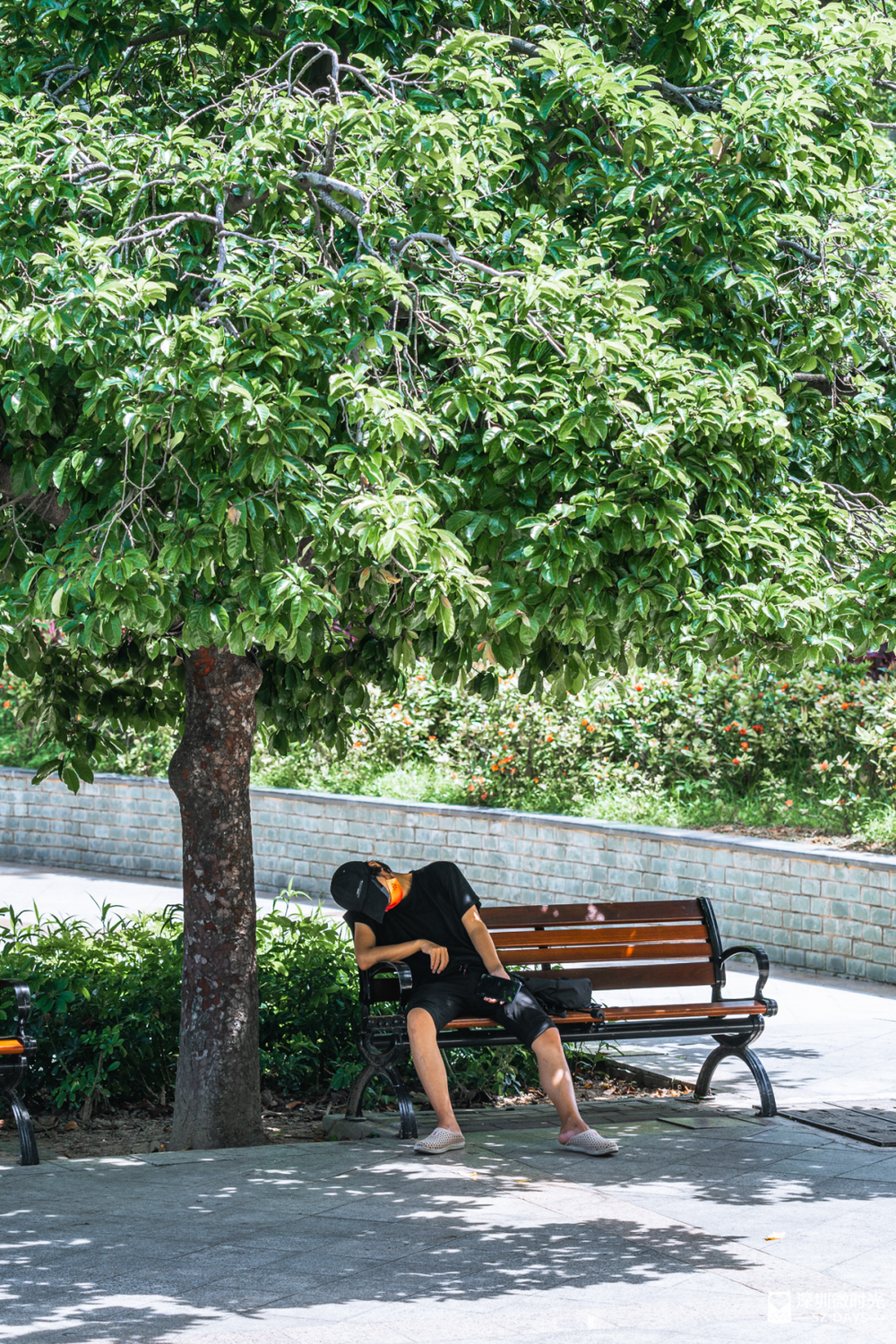 不论木椅还是石凳,总有人能准确找好姿势,安稳地补觉。