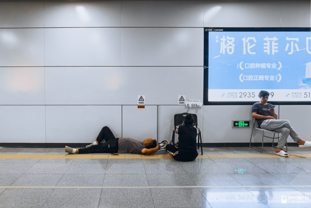 在街头、在公园、在地铁等公共场所,一块板、一张椅、一堵墙、一瓶水......任何一个能靠住的地方,都是深圳人的“临时床铺”。