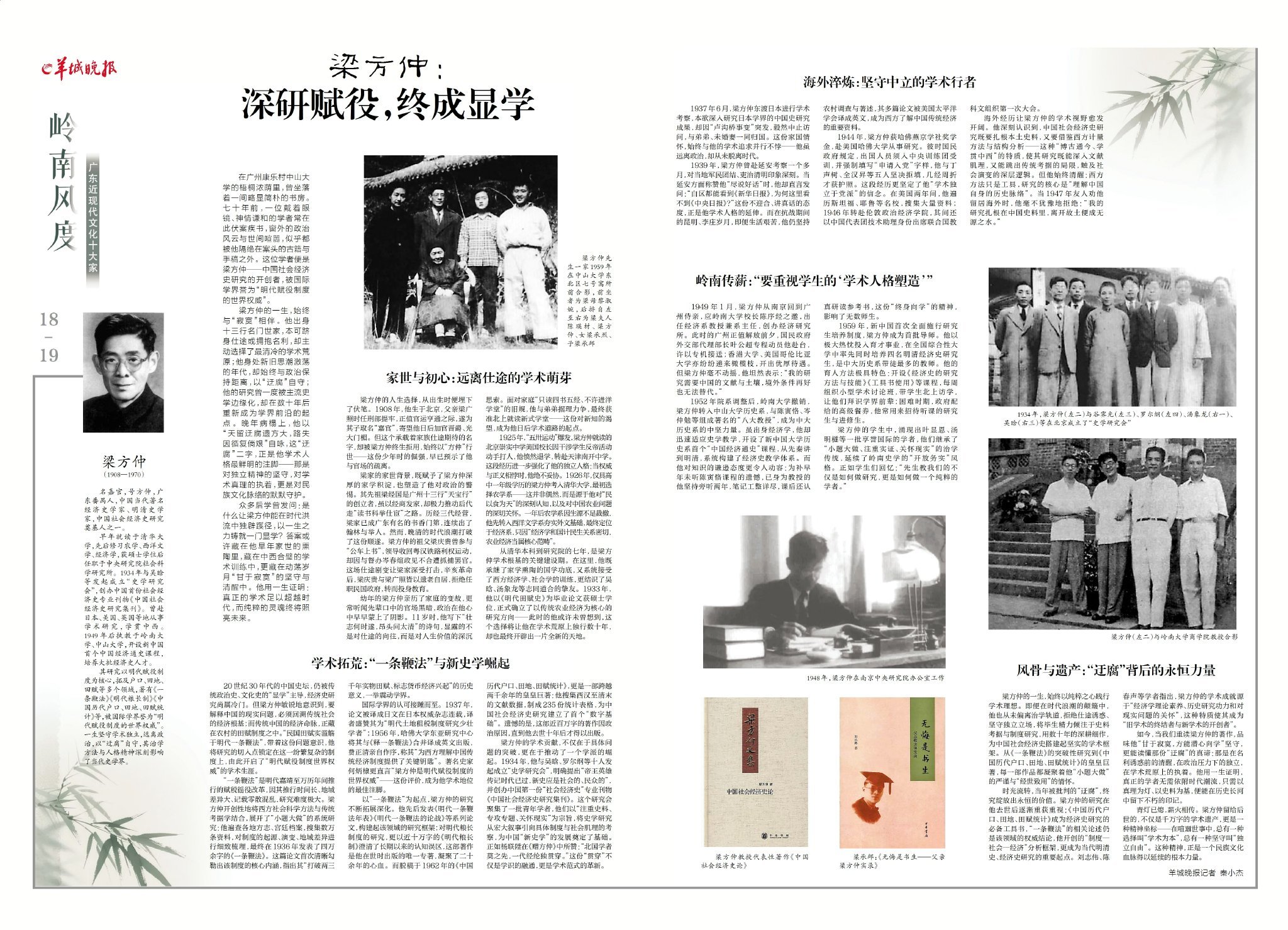 在广州康乐村中山大学的梧桐浓荫里,曾坐落着一间略显简朴的书房。七十年前,一位戴着眼镜、神情谦和的学者常在此伏案疾书,窗外的政治风云与世间喧嚣,似乎都被他隔绝在案头的古籍与手稿之外。这位学者便是梁方仲——中国社会经济史研究的开创者,被国际学界誉为“明代赋役制度的世界权威”。