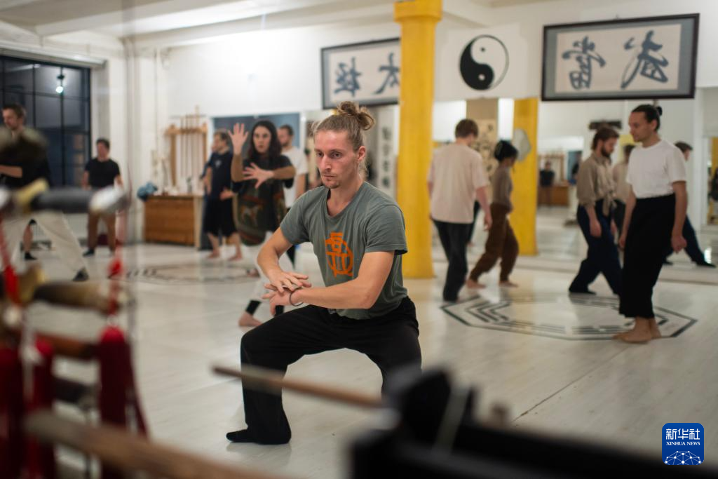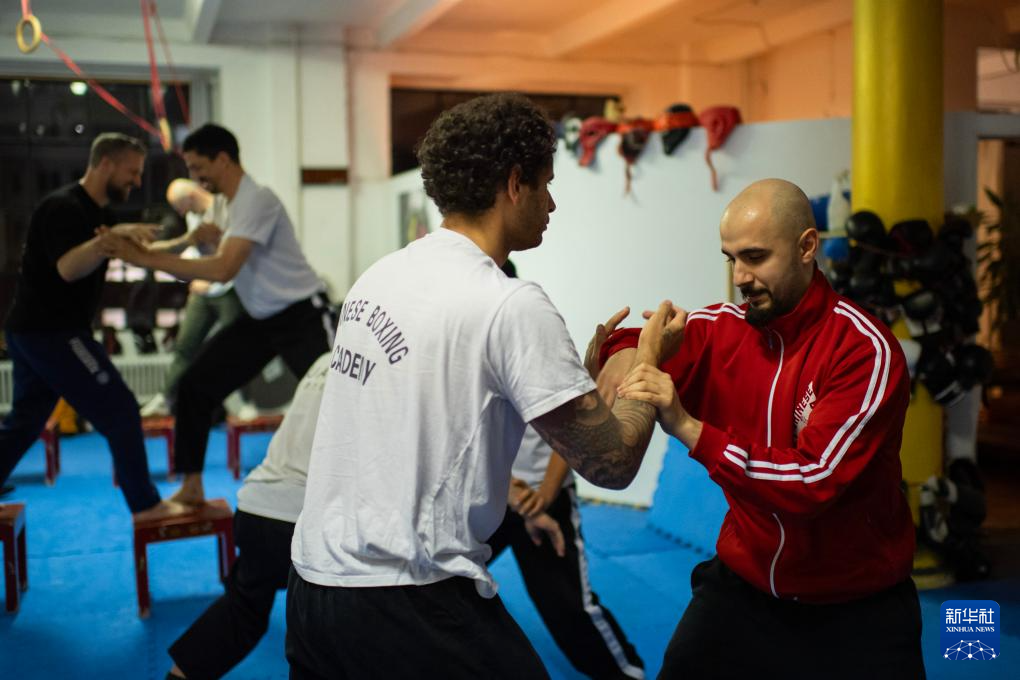 11月13日,学员在德国柏林“玄”武术馆练习武术(镜像)。