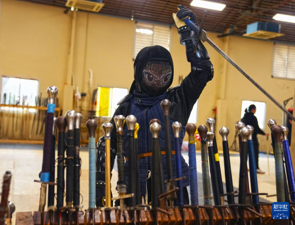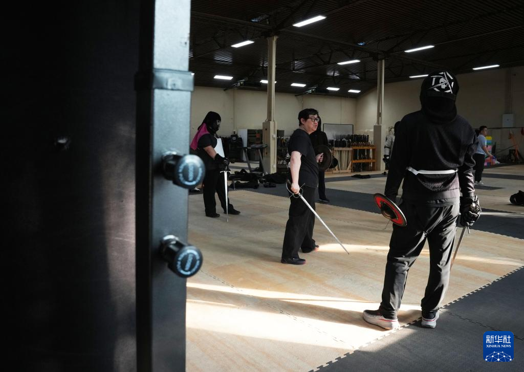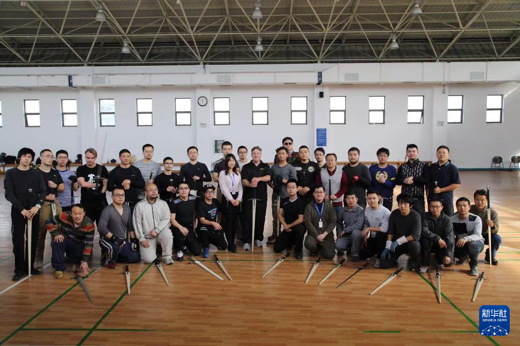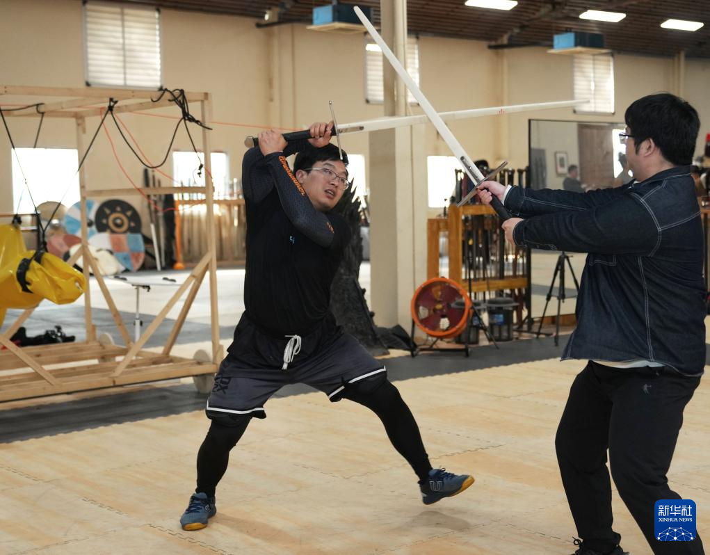 11月22日,佘予然在上海历史武术俱乐部与伙伴对练长剑。