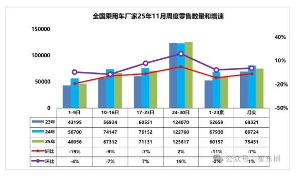 根据乘用车市场信息联席会(乘联分会)最新数据,2025年11月全国乘用车市场呈现“批发稳增、零售微降”的态势。当月厂家批发销量达299.2万辆,同比增长2%,环比增长2%;1至11月累计批发2676.6万辆,同比增长11%。零售方面,11月终端销量为226.3万辆,同比下降7%,但环比微增1%;前11个月累计零售2151.9万辆,同比增长6%。