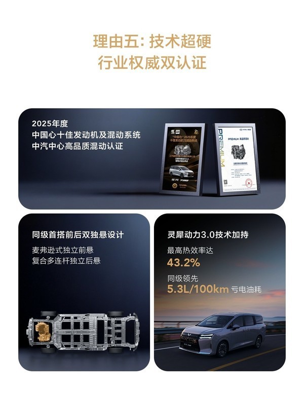 五菱星光730搭载的灵犀动力3.0技术,一举斩获“2025年度中国心十佳发动机及混动系统”与“中汽中心高品质混动认证”双项认证。这一成绩不仅是对五菱星光730技术实力的高度肯定,也标志着其在行业内的技术领先地位得到了权威验证。