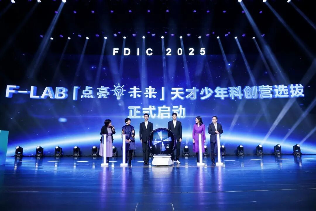 (许征,复旦大学校董马秀慧,复旦大学保险应用创新研究院执行理事长孔庆伟,以及学生代表共同启动本年度F-LAB「天才少年科创营」选拔仪式)