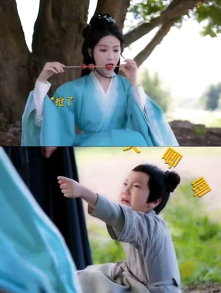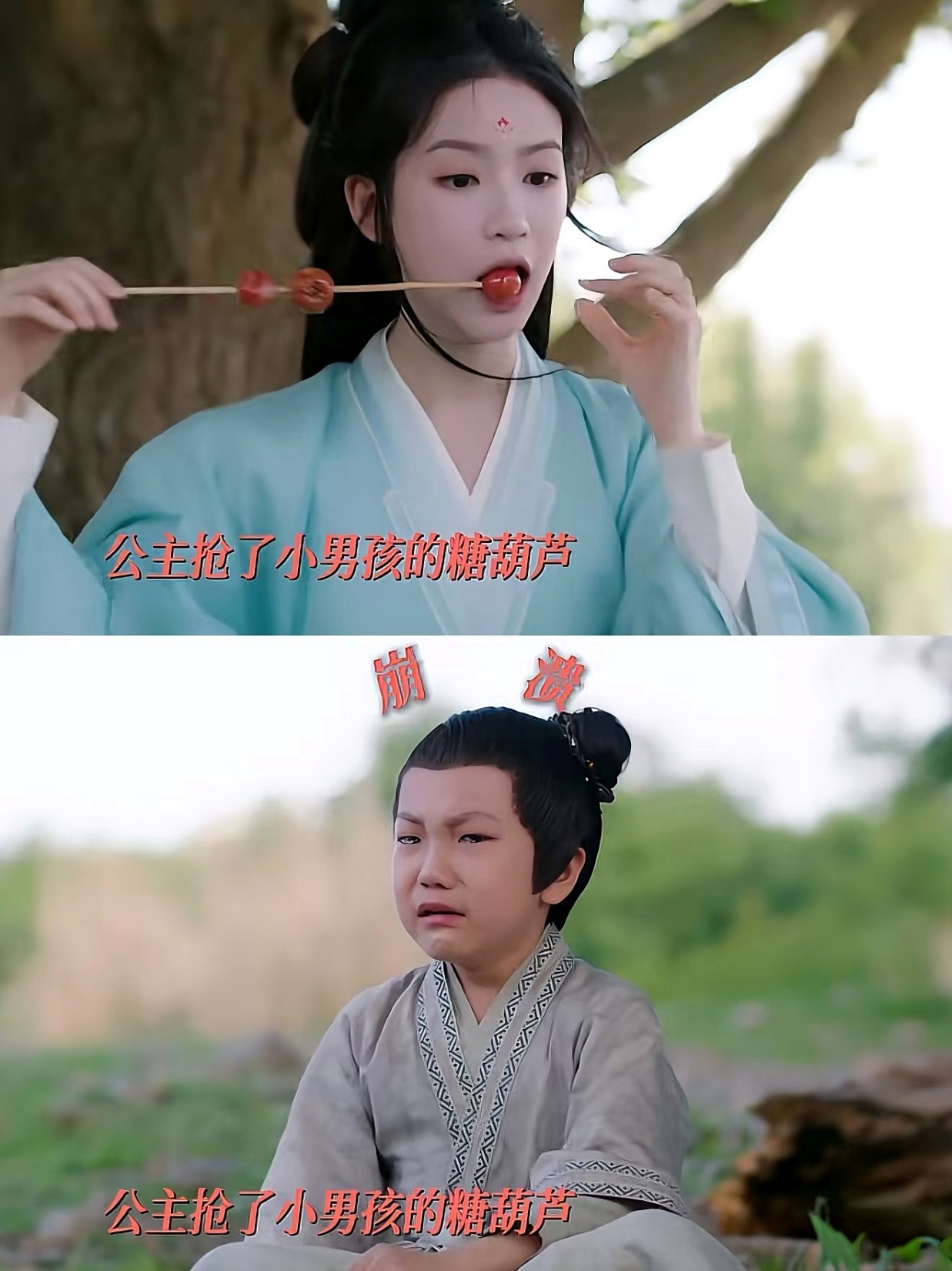 剧情中,萧荧因意外流落民间多日,饥肠辘辘时一眼盯上路边小孩手里的糖葫芦手比脑子快先拽走糖葫芦,谁料小孩反应更迅猛——嘴一瘪、泪珠子吧嗒掉,边抹眼泪边扯着嗓子喊:“你、你抢我糖葫芦!我找我哥来打你!”这幕“公主抢糖,娃子放话”的名场面,把观众逗得直拍大腿,萧荧啃着糖葫芦的嘴还没擦干净,糖葫芦娃鹤宸用小奶音和哭成一团的‘包子脸’精准演技戳中笑点。