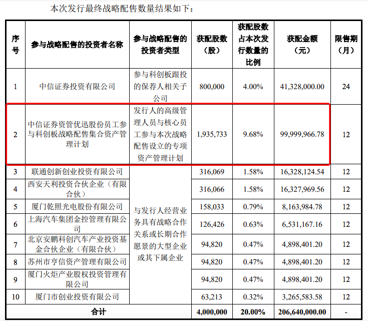 优迅股份IPO引入10家战略投资者,战配金额2.07亿元。其中,公司员工资管计划获配金额最多,达1亿元。