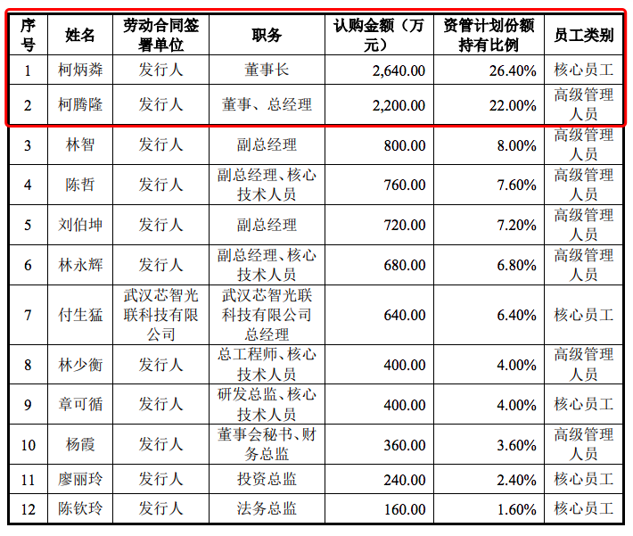 从优迅股份员工资管计划出资情况看,12名董事、高管、核心技术人员等参与认购。其中,实控人柯炳粦与柯腾隆父子拿到近半份额,柯炳粦认购2640万元,柯腾隆认购2200万元,共计4840万元,占到48.4%。