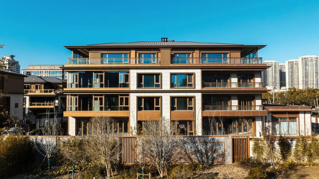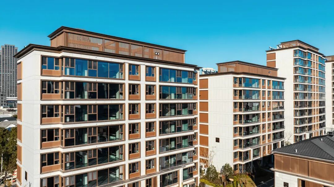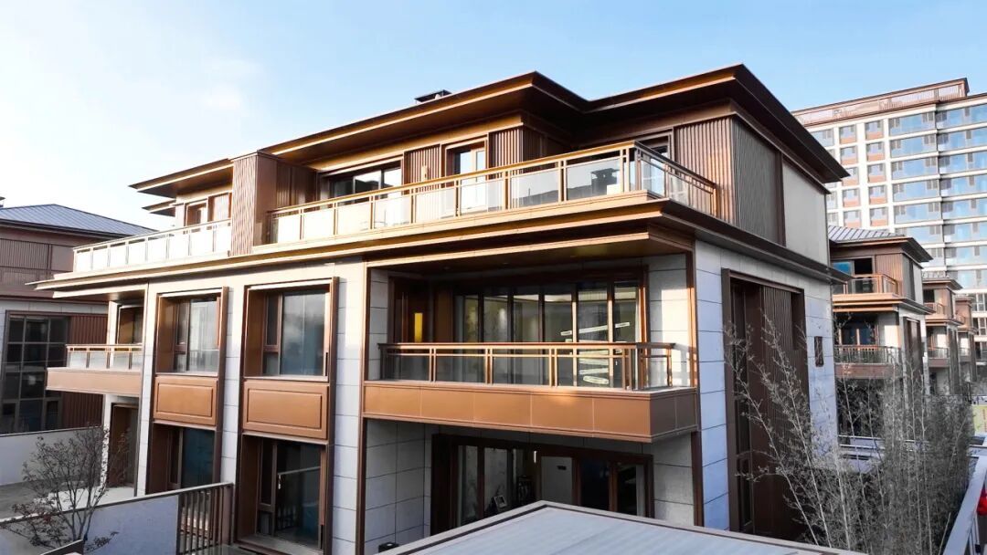 建筑立面臻选古铜色铝板+米白色石材,以现代笔法勾勒新中式轻奢气质,不仅提升了社区的质感与标识度,更成为焕新海门主城界面的一抹亮色。
