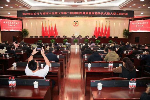 在全体与会人员见证下,湖南中医药大学第二附属医院(湖南省中医院)党委副书记、院长刘春华与省政协代表共同签署《健康管家医疗合作协议》,标志着双方在中医药健康服务领域的合作正式启动。