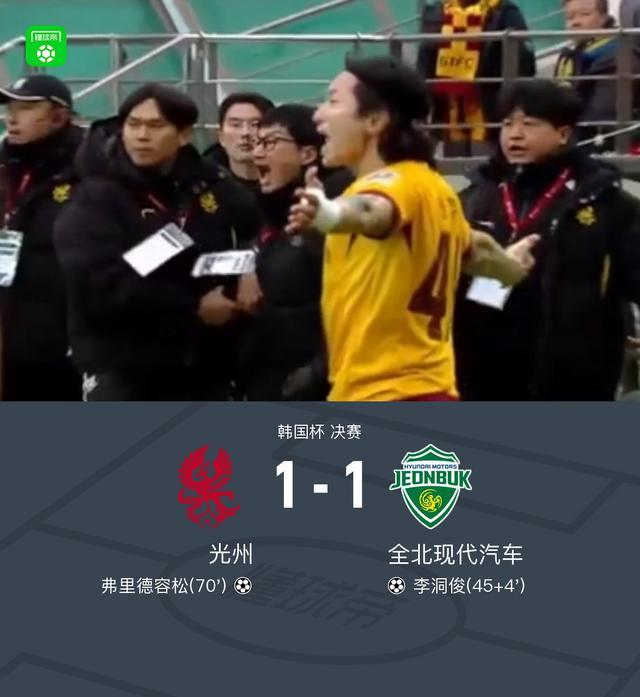 北京时间12月6日,韩国杯决赛在光州与全北现代汽车之间展开。上半场补时阶段,全北现代汽车由李洞俊率先破门,打破场上僵局。易边再战,第70分钟,伊斯内罗-雷斯送出助攻,弗里德容松接球后完成破门,帮助光州扳平比分。此后双方均未能再度改写比分,最终以1比1结束常规时间较量。