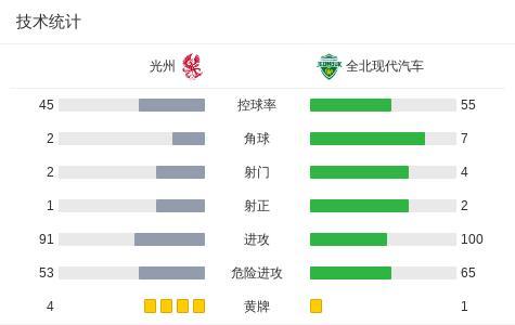 第45+6分钟,金耿民被队友撞倒后脱手,李洞俊破门,全北现代1-0光州