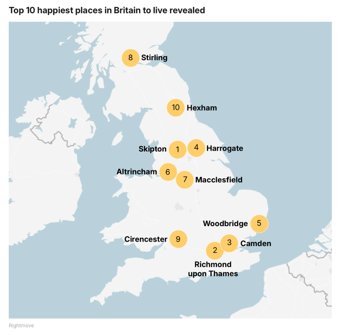 房地产网站Rightmove通过对当地居民进行采访,评选出2025年英国最幸福居住地榜单——