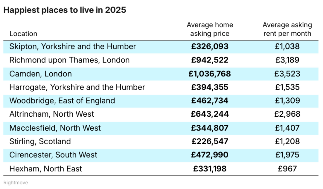 下面是Rightmove评选的2025年英国最幸福居住地榜单前十名(附各地房产均价和月租均价)。伦敦有两地上榜,分别是里士满(第二名)和卡姆登(第三名)。