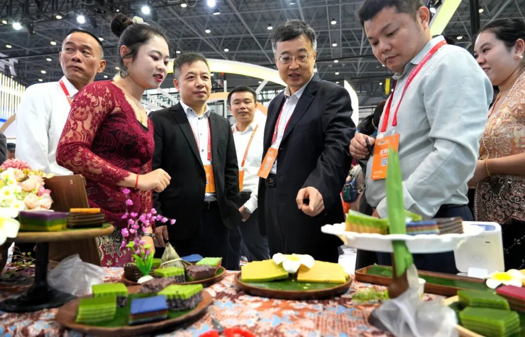 在万宁展区内,盖文启一行逐一走访各企业展位,认真察看“一片叶、两棵树、两条鱼”及各类热带高效农产品的陈列展示,并与参展企业亲切交流,询问了解产品的生产加工、市场销售、品牌建设等情况。