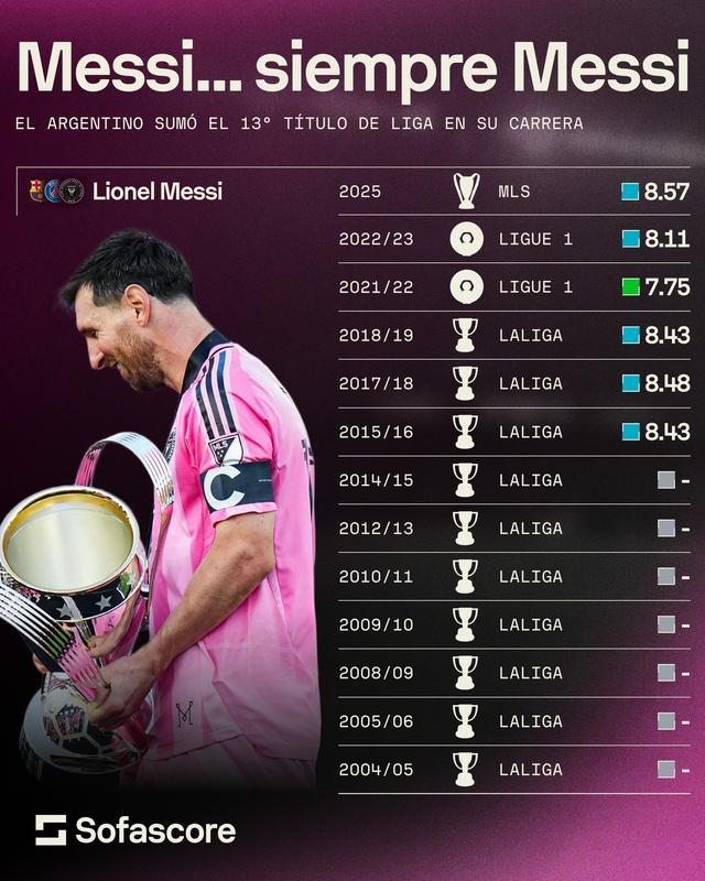 梅西的联赛冠军之路始于巴塞罗那,并延伸至巴黎圣日耳曼,如今在迈阿密国际达成新的里程碑。