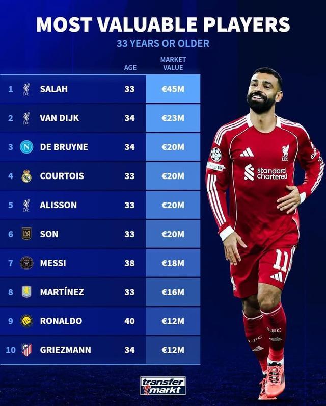 北京时间12月7日,德转列出了目前世界足坛年龄在33岁或以上球员身价前10,近期陷入风口浪尖的萨拉赫以4500万欧元高居第一,梅西1800万欧元排名第七,C罗1200万欧元排名第九。