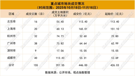 成交方面,据观点指数不完全统计,2025年10月18日-2025年11月16日期间,6个重点城市一共有155宗地成交,成交价446亿元,环比上升152.77%,成交土地面积397.55万平方米,环比回升31%。