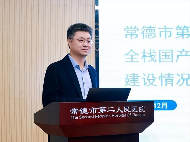 (▲常德市第二人民医院党委书记马明祥介绍全栈国产化智慧医院信息化建设情况)