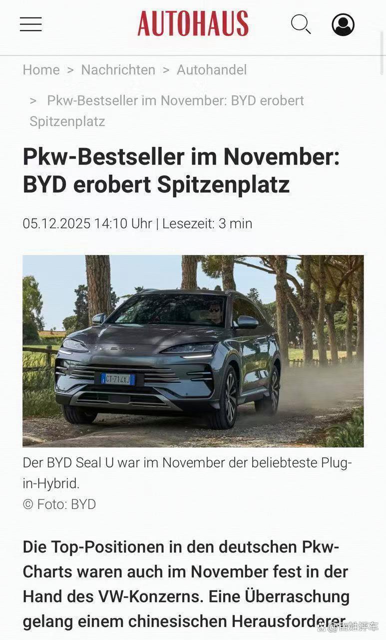 近日,BYD SEAL U(宋PLUS)成为德国11月车市插混车型销量冠军,引发行业广泛关注。这不仅是中国汽车品牌首次在德国主流细分市场登顶,更意味着比亚迪在欧洲的规模化突破已进入全新阶段,印证中国新能源车海外的深度认可。