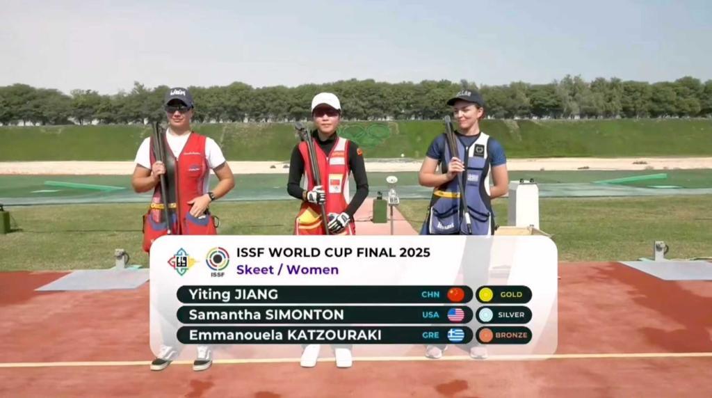 新华社多哈12月8日电 2025年国际射联世界杯总决赛8日在多哈收官,中国选手江伊婷在女子双向飞碟决赛中弹无虚发,以36靶全中的成绩夺冠。中国队最终以4金2银3铜位居奖牌榜榜首。