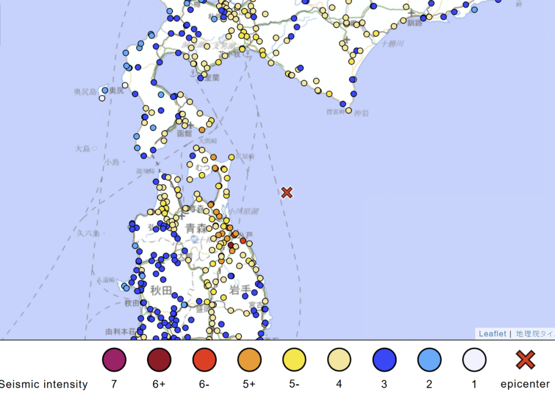 在日本1至7级地震烈度等级中,此次地震在青森县被评为“上六级”——震感强烈,以至于人们无法站立或移动,只能匍匐前进。在这种程度的地震中,大多数重型家具都会倒塌,许多建筑物的墙砖和窗玻璃也会受损。