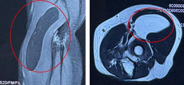 (▲MRI结果显示:右肘关节周围肌间隙内含脂肪信号占位,性质待定)
