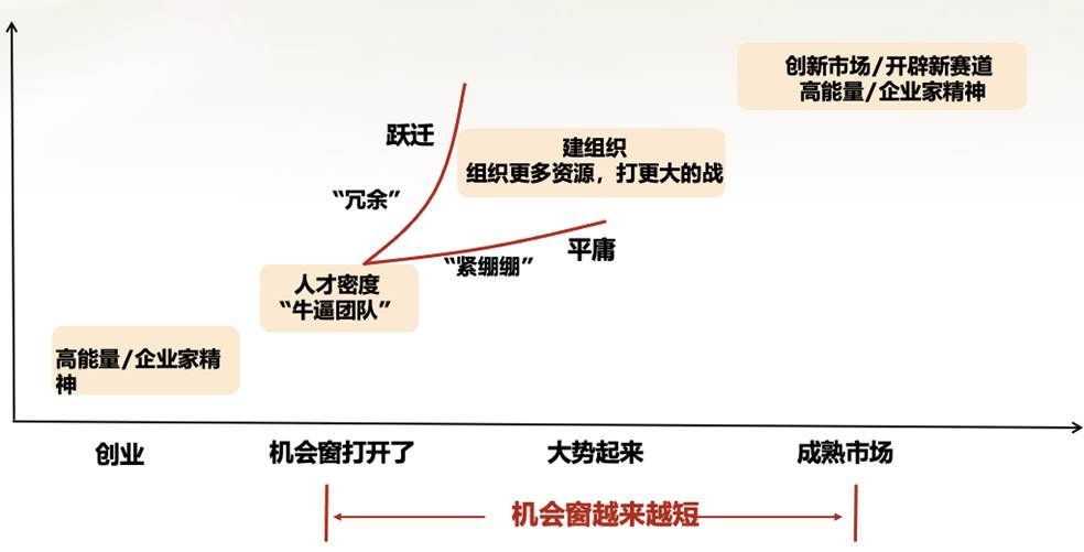 这个阶段仅靠创始人带着几个核心成员是不够的,需要“要素人才配齐”——技术、营销、运营、融资等关键岗位的人才必须到位,以提升整体的人才密度。如果人才密度跟不上,企业就会痛失许多发展机会。这也是为什么很多企业关键时刻做不大的根本原因:人才密度不够,到最后还是老板一个人最厉害,企业自然难以扩张。我们常看到一些企业“起了个大早,赶了个晚集”,原因就在于此:市场早期被你开创出来了,但当需要迅速扩大组织和人才规模以抓住爆发机会时,企业却迟迟不招人。结果,其他组织力量更强、资源更丰富的大企业发现机会后便“大兵压境”。很多时候,小企业创造了市场,但到了大兵团作战、市场规模形成时,却因自身队伍太薄弱而败下阵来。