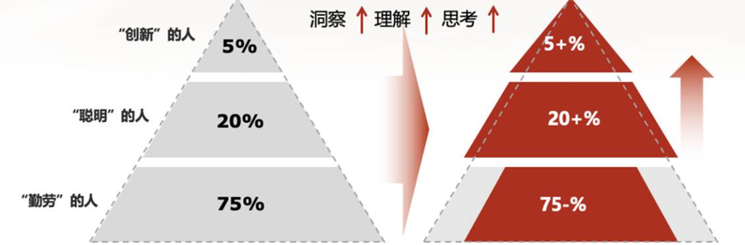 在工业时代,人才结构是典型的金字塔形态:底层是大量负责执行的“勤劳的人”,中间层是少数“聪明人”,塔尖则是极少数“创新者”。那时,一个创意从顶层产生,底层负责具体执行。但AI时代来临后,纯粹依赖体力和重复劳动的“勤劳的人”需求正在减少,金字塔的底座在收缩;而善于识别、判断和提问的“聪明人”需求在增加,“创新者”也同样被大量需要。整个人才结构正在被重塑,进入人工智能时代,纯执行性的工作已经没有优势。我们必须增加“聪明人”——那些能识别、能判断、能提问的人的比例。同时,创造性人才也必不可少,因为所有确定性的工作终将被AI替代。因此,AI时代带来的人才结构演变趋势,是每一家企业都必须应对的挑战。