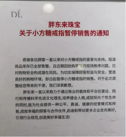 近日,胖东来超市一款“小方糖戒指”在社交媒体上走红,因其样式美观且售价低廉,吸引大量消费者抢购。12月8日,网友分享的一份胖东来珠宝通知显示,“小方糖戒指”正式停售,原因是商品库存已售罄,且近期因抢购导致的现场秩序问题已对购物安全构成潜在风险。